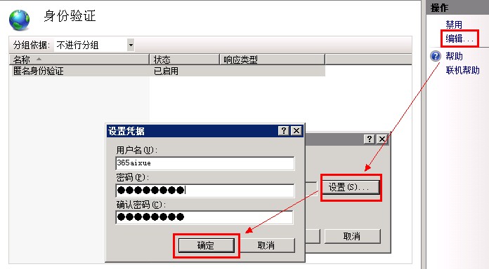 3.IIS7.5中選擇網(wǎng)站,在右邊的功能視圖中選擇身份驗(yàn)證,編輯【匿名身份驗(yàn)證】為新建的365aixue
