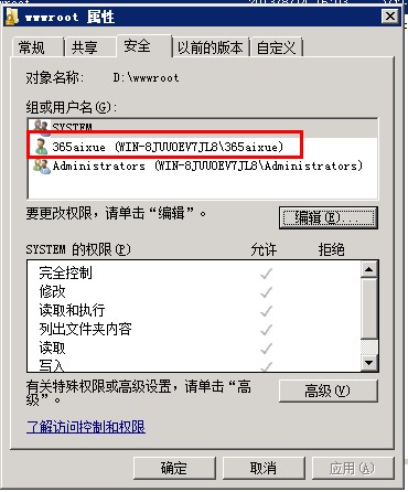 4.在磁盤網(wǎng)站目錄中添加365aixue 用戶的讀取和修改權(quán)限