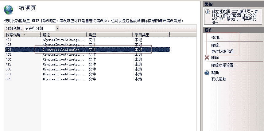 3、出現(xiàn)錯(cuò)誤頁設(shè)置頁面,今天我們這邊只說明一下404如何設(shè)置,諸如500、503等這里先不考慮。雙擊404錯(cuò)誤頁面那項(xiàng),或選中404那項(xiàng)點(diǎn)擊右側(cè)的編輯按鈕