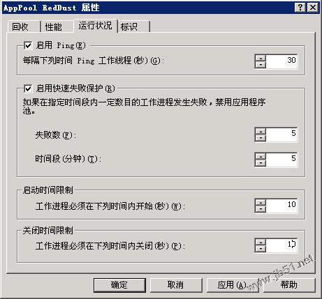關閉時間和啟動時間間隔設置:設短一些比如10秒,這樣當您的網站程序大量占用系統資源時IIS自動快速回收進程并且快速啟動進程,您的網站暫時還可以將就著工作。