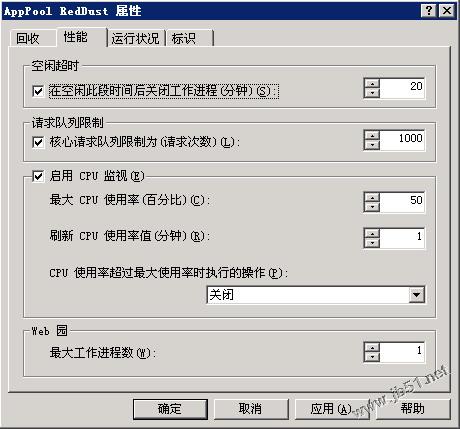 首先是對CPU的限制:在啟用cpu監視后,我設置該應用程序池最大的cpu使用率為50%。設置刷新cpu時間為1分鐘,設置操作為“關閉”。最大工作進程數設置為1。這個意思是,IIS刷新檢測該獨立池的CPU使用情況時間為1分鐘,如果超過設置的cpu限制50%,就會發出關閉池的指令,要求池在指定的時間內關閉。如果池成功在這個時間內關閉,IIS會重啟動一個新池,此段時間很短,一般不會有什么感覺,池就重新開啟了,對于訪問網站的人基本是不會有感覺的。但如果池沒有在指定時間內關閉,IIS就會強行關閉它一個刷新CPU時間。在這個停止的時間內,網站無法訪問,提示“Service Unavaliable”。