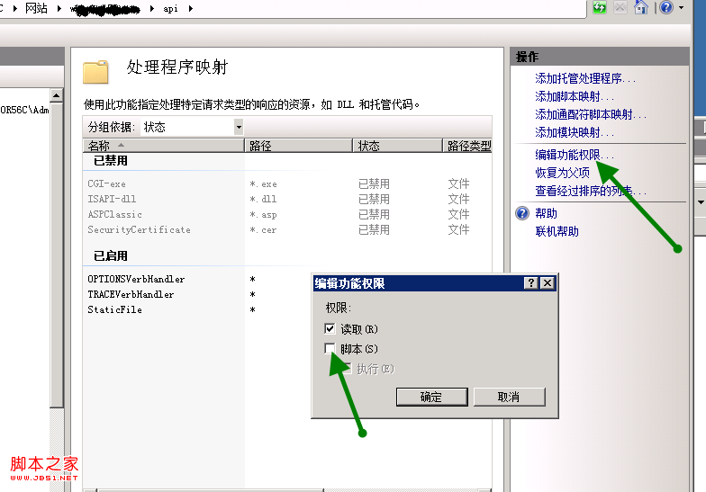 1、先選擇需要取消權限的目錄,然后在右邊可以看到 “處理程序映射” 雙擊打開。