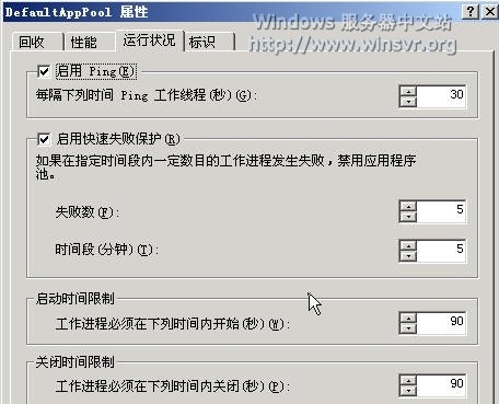 關閉時間限制:當IIS檢測到某個工作進程出現故障時,將此工作進程標記為關閉,此選項指定了IIS等待工作進程自動關閉的時間限制,如果超出此時間限制后工作進程尚未關閉,則IIS強行關閉工作進程。