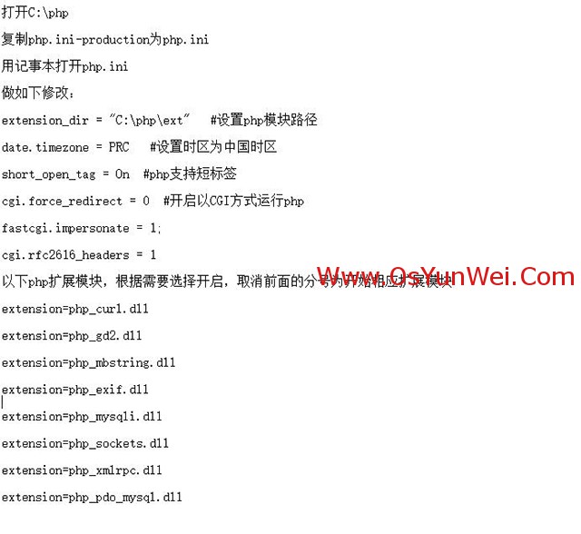 extension_dir = "C:/php/ext" #設置php模塊路徑date.timezone = PRC #設置時區為中國時區short_open_tag = On #php支持短標簽cgi.force_redirect = 0 #開啟以CGI方式運行phpfastcgi.impersonate = 1;cgi.rfc2616_headers = 1