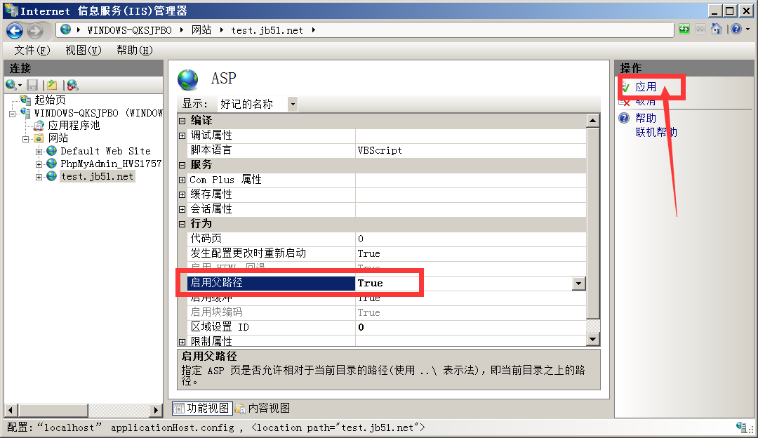 在IIS管理器中找到ASP圖標,雙擊進去編輯,把啟用父路徑改為"true",然后點擊右邊的應用即可。