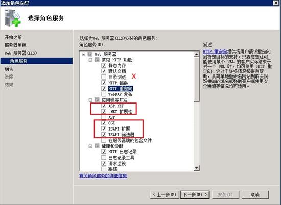 添加ASP.NET 、.NET 擴展性、CGI、ISAPI 擴展、ISAPI 篩選器,去掉 目錄瀏覽(因為大多數網站用不到。)