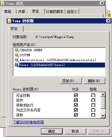 點(diǎn)擊“安全”tab頁(yè),點(diǎn)擊“編輯”按鈕,選擇“Users”,勾選“完全控制”和“修改”復(fù)選框,確保選中全部權(quán)限,點(diǎn)擊確定返回。