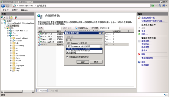 點(diǎn)擊“應(yīng)用程序池”,在右邊的列表中找到“Oriole”站點(diǎn),雙擊打開(kāi)“編輯應(yīng)用程序池”對(duì)話框,選擇.Net Framework 4。