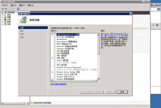 在“添加功能”向?qū)?duì)話框中,選擇.Net Framework,點(diǎn)擊下一步執(zhí)行安裝。