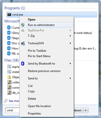 在開(kāi)始->查找框中輸入cmd,右擊cmd.exe,選擇Run as administrator,進(jìn)入命令行界面。