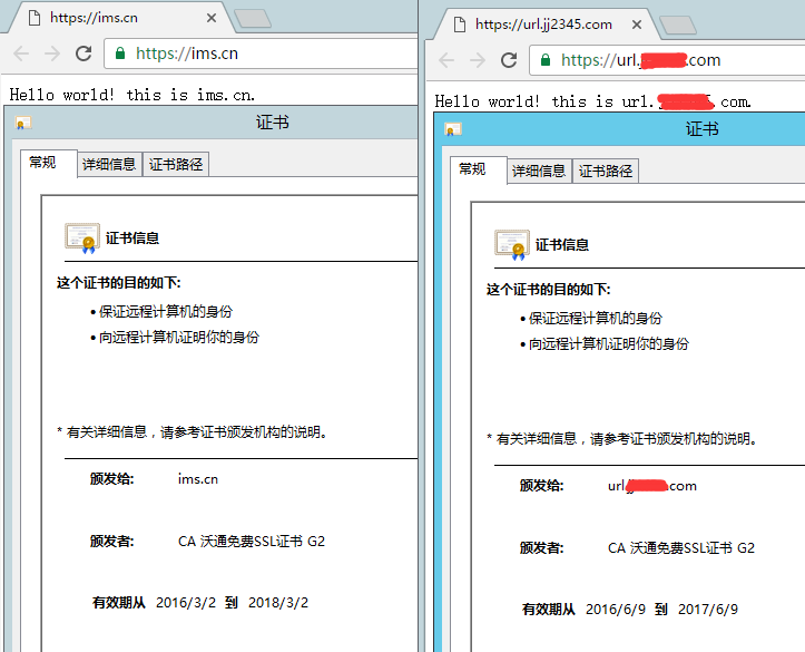 在瀏覽器中分別https訪問這兩個域名,驗證效果: