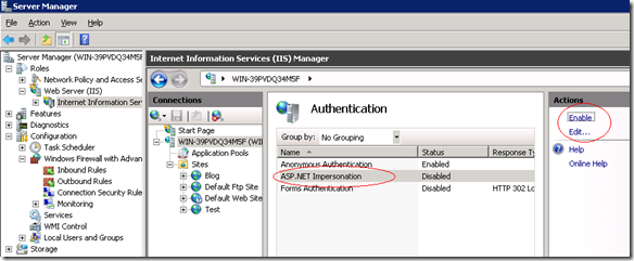 在這個圖中我們看到 IIS7 多了一個 ASP.NET Impersonation 的功能,在 Actions 里面點 Enable 開啟身份模擬功能,然后點 Edit 編輯身份模擬。