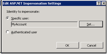 也就是說 Asp.net 沒有用我設置的這個 MyAccount 帳號模擬運行,而是仍然用IUSR 帳號模擬運行。查了好久,才發現是下面問題造成: