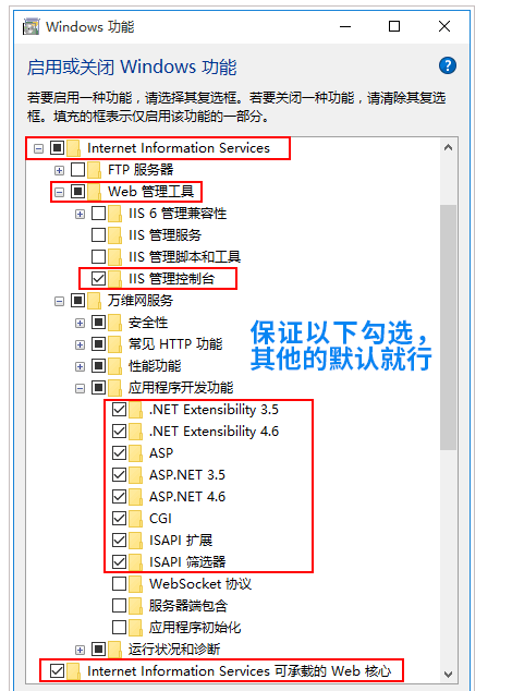 3、在“Windows功能”對話框里選中“Internet Information Services”,在Internet Information Services功能展開選擇框里根據你的需要選擇需要的功能就行了,比如要用FTP功能,能運行ASP.NET程序等等,只要選中這些功能就行了,并點擊“確定”按鈕;然后保證以下勾選,其他的默認就行,點擊確定。如圖: