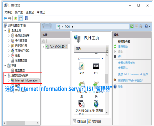 6、在出現的界面中,分別點擊右側的【服務和應用程序】-->【Internet Information Services(IIS) 管理器 】,我們可以看到中間有很多圖標,找到ASP,點擊;可以看到這樣的頁面,這是配置asp應用程序,找到啟用父路徑,選為True;
