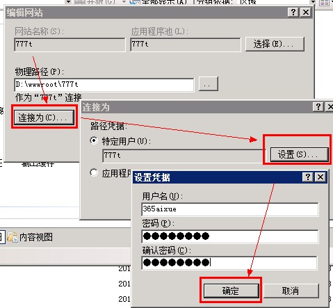 2.IIS7.5中新建網(wǎng)站時(shí)物理路徑下面有個(gè)【連接為...】,點(diǎn)開后設(shè)置為特定用戶為之前新建的365aixue