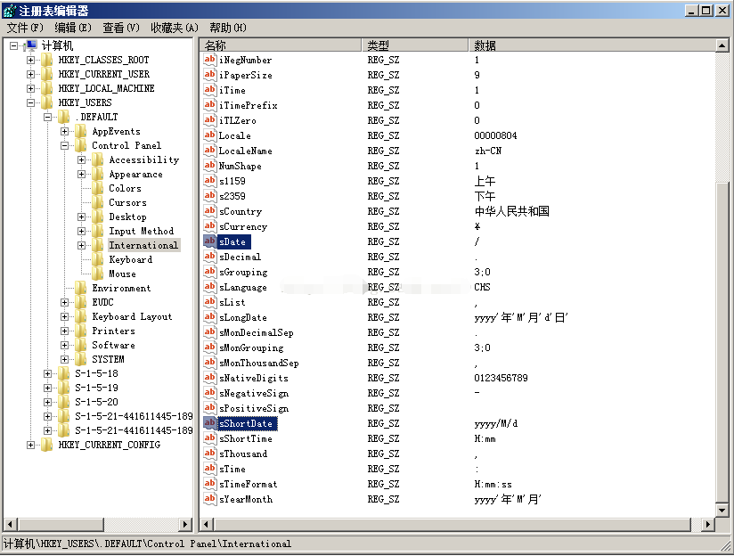 1、“regedit打開注冊表”,找到“HKEY_USERS/.DEFAULT/ControlPanel/International”