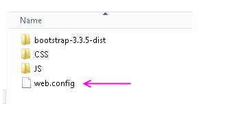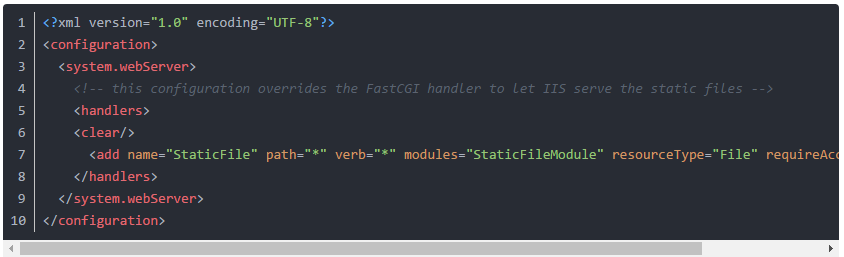 1、在項目的具體app路徑下的static文件夾(settings中STATIC_URL指定的目錄),新建web.config文件,注意不要弄錯目錄,是app中存放靜態文件的目錄下。