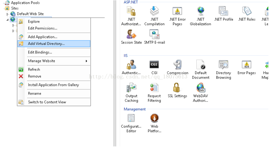 3、打開IIS管理器,選定該網站項目,右擊選擇添加虛擬路徑。