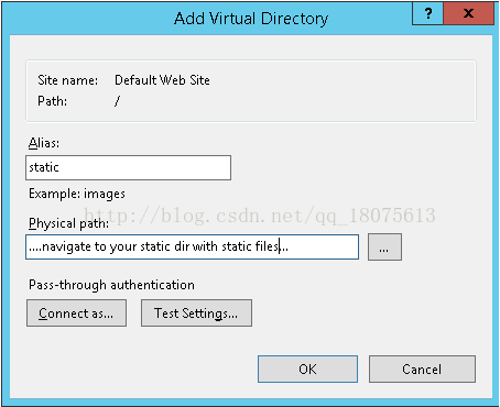 4、填寫虛擬路徑的別名和路徑,別名一般為static,路徑則是該網頁app下的static文件夾,也就是剛才創建web.config的文件夾。