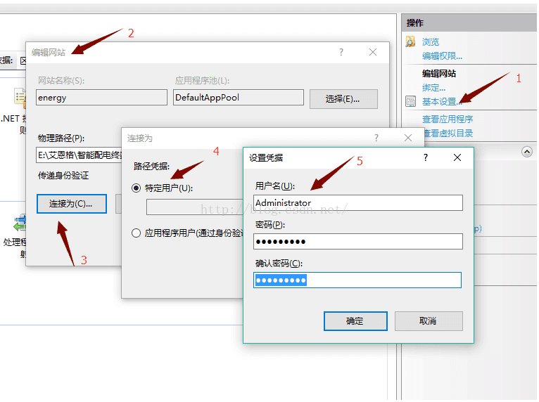 單擊選中當前配置的網站,點擊右側的基本設置,編輯網站,連接為,特定用戶,添加用戶,用戶名為:Administrator密碼:本機登陸密碼(自己設置的開機密碼)。