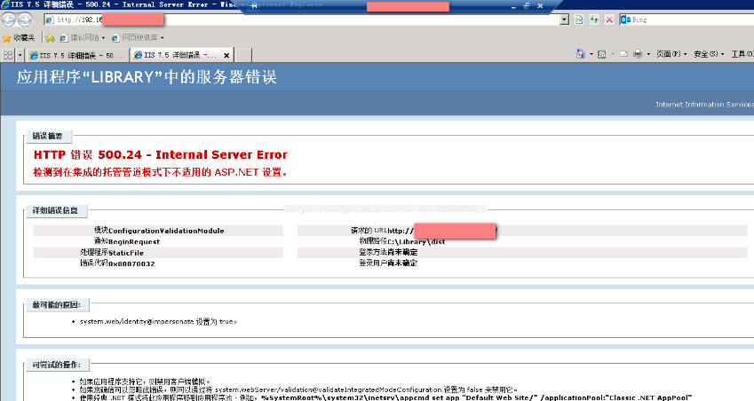 2、HTTP錯誤500.24-InternalServerError,檢測到在集成的托管管道模式下不適用的ASP.NET設置。