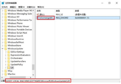 2、依次打開“HKEY_LOCAL_MACHINE/SOFTWARE/Microsoft/WindowsUpdate”,找到并打開UX下的“IsConvergedUpdateStackEnabled”項,如圖: