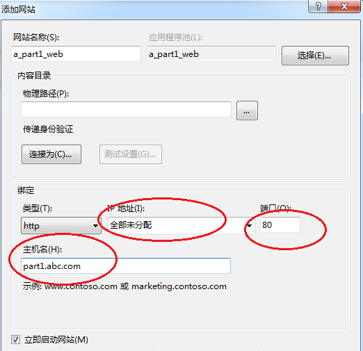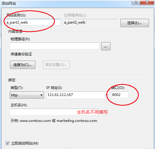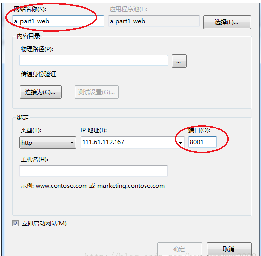 網站名稱為a_part1_web,端口號這里輸入8001,不使用默認端口80,