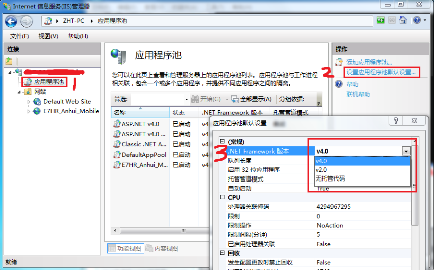 另外注意:在IIS7上部署網站時,IIS默認使用的是.NETFramwork2.0,如果運行.NET4.0和.NET4.5應用程序,則需要修改“應用程序池”的設置,將2.0版本修改為4.0。修改方法如下圖所示: