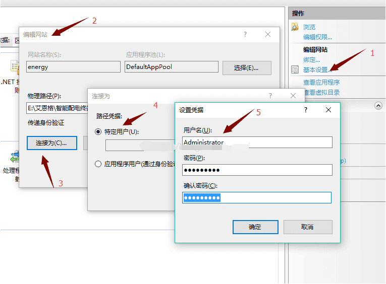 解決方案:單擊選中當前配置的網站,點擊右側的基本設置,編輯網站,連接為,特定用戶,添加用戶,用戶名為:Administrator密碼:本機登陸密碼(自己設置的開機密碼),于是一切就ok啦~~~