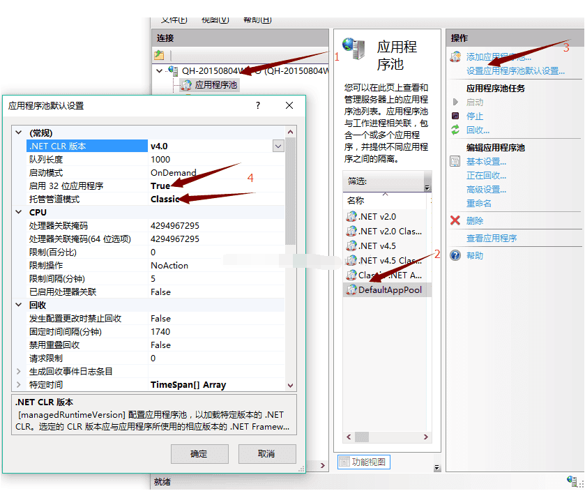 打開IIS管理器,選擇應用池(你建立網站時選擇的應用池),單擊右側的“設置應用程序池默認設置”,然后把啟用32位應用程序改為True,托管管道模式改為Classic