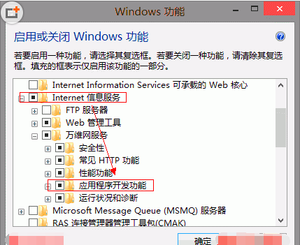 4、如果需要.net可以在其前打上對號,確定即可。等待成功后重啟計算機。輸入http://localhost/看是不是會出現iis8標示。如下圖: