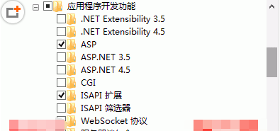 3、點開“Internet信息服務”,找到其下的“應用程序開發功能”項,勾選asp、服務器端包含等。如下圖所示: