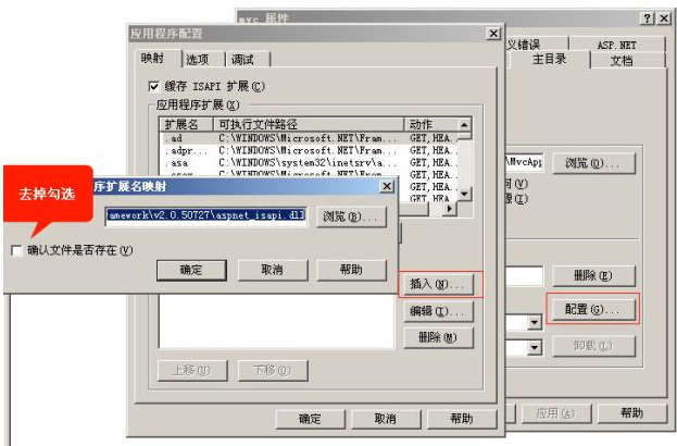 C:/Windows/Microsoft.NET/Framework/v4.0.30319/aspnet_isapi.dll,擴(kuò)展名為“.mvc”,將“檢查文件是否存在”的勾去掉。參見下圖設(shè)置。