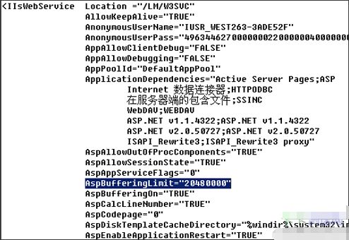 用純文本方式打開,找到AspBufferingLimit把它修改為需要的值(可修改為20M即:20480000)。