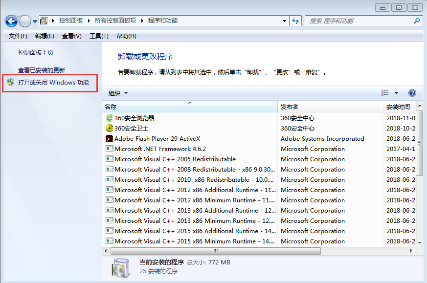 3、進入了“程序和功能”之后,我們點擊“打開或關閉Windows功能”打開;