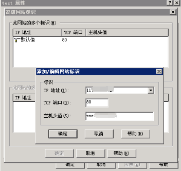 8、點擊“高級”,然后點擊“添加”,可以給網站多綁定幾個域名,輸入ip地址和要綁定的域名,然后確定;