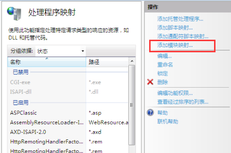 (2)點擊“Internet信息服務(IIS)管理器”,點擊“選擇計算機當前用戶”,在IIS欄雙擊“處理程序映射”,然后點擊右邊的“添加模板映射”: