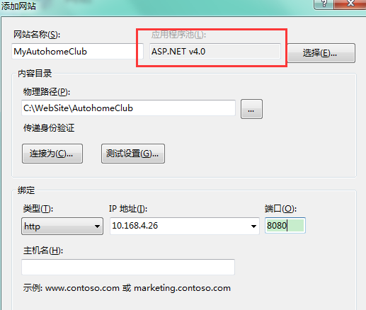 (1)、彈出“添加網站”對話框,我們在“應用程序池”處選擇“ASP.NETv.4.0”;