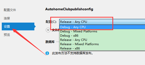 (3)、還是在“發布web”界面中,點擊“設置”,在“配置”處選擇“Debug-AnyCPU”,選擇好了之后點擊“預覽”,然后點擊“發布”;