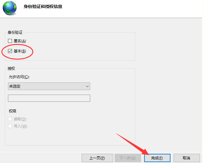 7、在“身份驗(yàn)證和授權(quán)信息”中的身份驗(yàn)證處選擇“基本”,授權(quán)那里不用管,點(diǎn)擊完成就可以了;