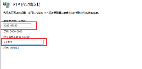 3、打開之后,我們在“數據通道”處輸入“1025-65535”的范圍數,在“防火墻的外部IP地址”處填入ip地址;