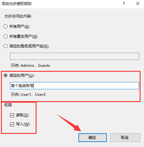 6、在彈出的“添加允許授權規則”中,我們選擇“指定的用戶”,在“權限”處勾選上“讀寫”和“寫入”,然后點擊確定。