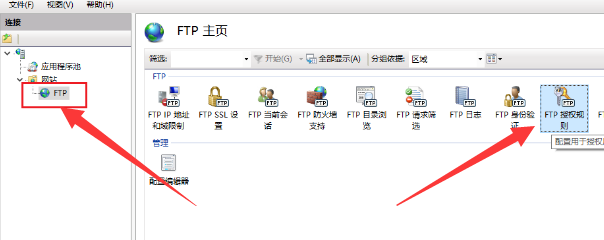 4、然后我們展開左邊的“網站”,點擊“FTP”,打開FTP主頁,然后雙擊打開“FTP授權規則”;
