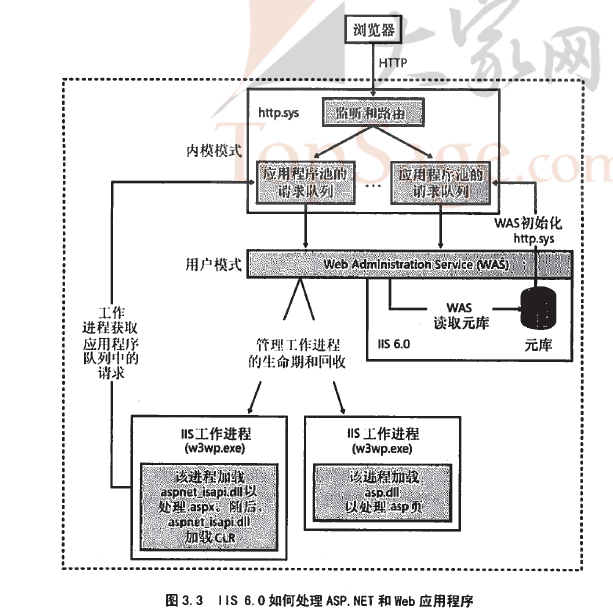 在IIS6。0進程模型下,asp.net運行的更快,因為在inetinfo.exe(iis可執行的)和工作進程之間不需要任何進程間通信。HTTP請求直接托管CLR的工作進程中被交付。此外ASp.net工作進程不是一個特殊進程,它只是IIS工作進程的一個副本。這一事實將進程回收、頁面輸出緩存和運行狀況檢查的負擔轉嫁給IIS(摘自c#技術內幕)
