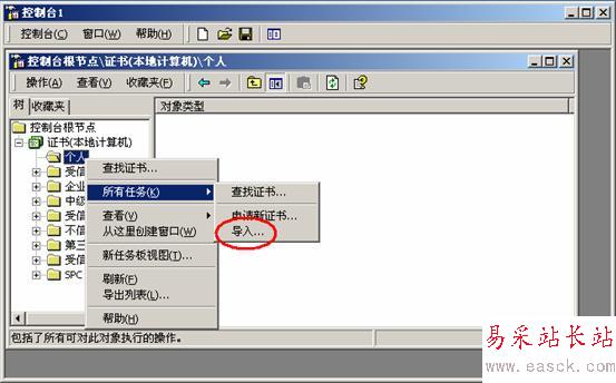 6.選擇“證書”-“個人”,右鍵展開后,選擇“所有任務”-“導入”: