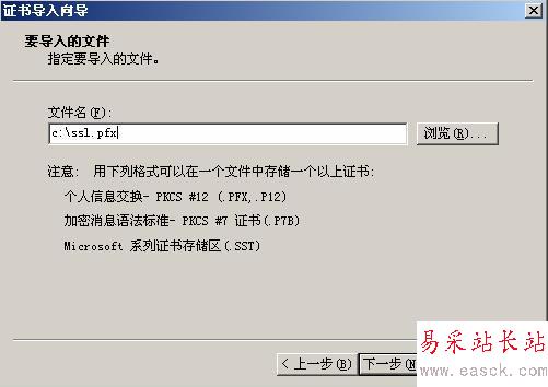 8.選擇需要導入的證書,C:/SSL.PFX,點擊“下一步”: