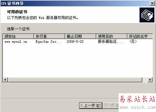 13.在列表中選中剛才導入的證書,點擊“下一步”,再點擊“下一步”,完成證書的分配。則IIS 5的證書安裝完畢。