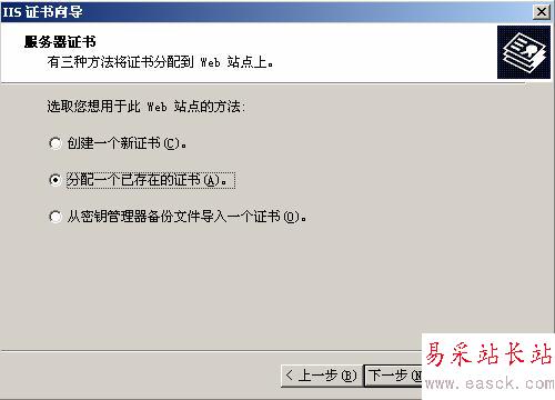 12.點擊“服務器證書”,選擇“分配一個已存在的證書”,點擊“下一步”: