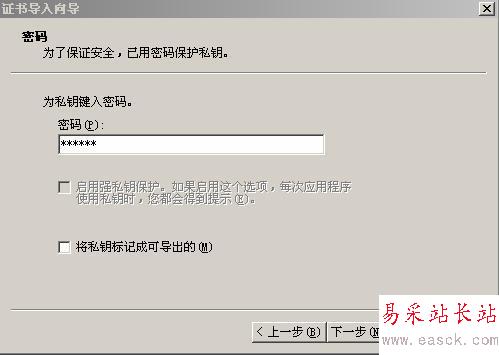 9.輸入證書密碼,就是在證書合并時設定的密碼,(推薦不要選擇“將私鑰標記成可導出的”,如果選擇此項,其他人可能從服務器上將證書導出),點擊“下一步”: